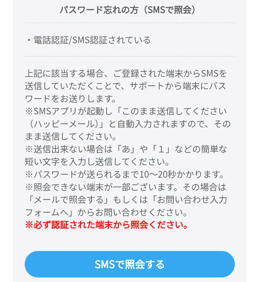 ただし、SMS照会とパスワード再設定ではハッピーメール会員登録時の電話番号が必要で、もし登録時から機種変更して電場番号も変わってしまっていたという場合にはこの方法は不可能になるかもしれません。