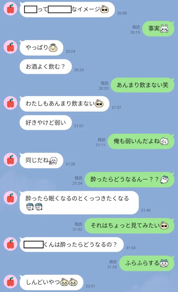 いいかもとかくれた方に対してはこれくらいスピード感持ってLINEやカカオ交換打診しても通ることがほとんどです。