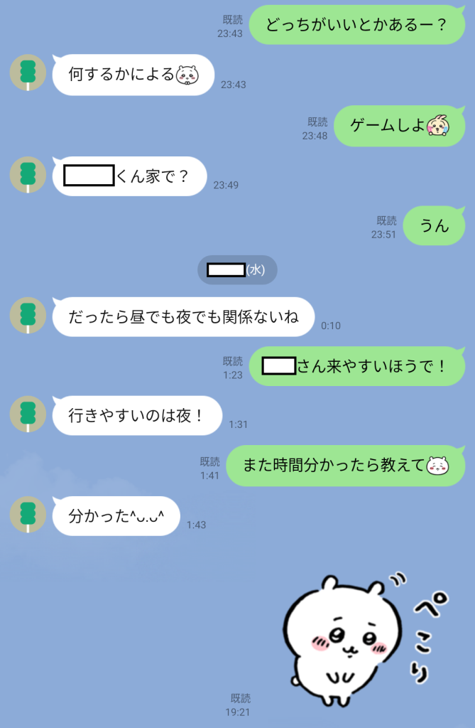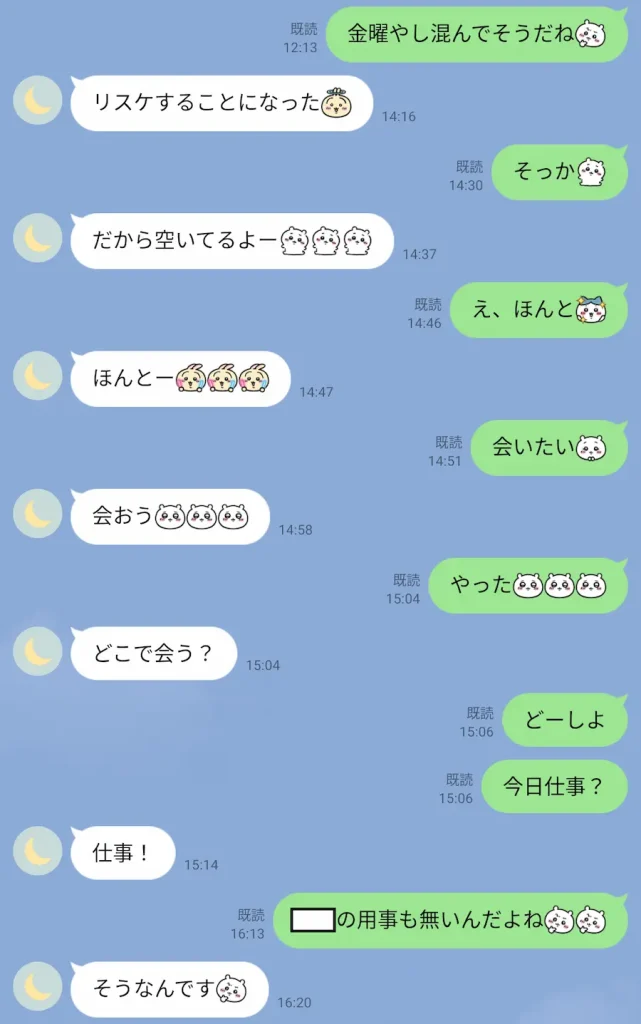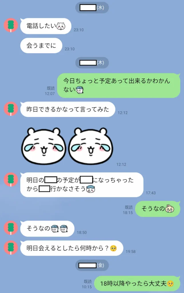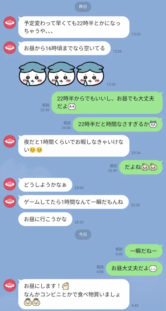 この日も仕事みたいだし、次の日は休みっぽいけど家呼ぶなら昼くらいの方が通りやすそうやなと思ってリスケすることにしました。