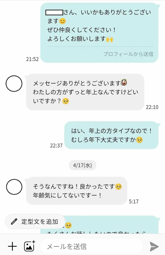 一応会話の為に「年下大丈夫ですか」と聞いてますが、向こうからいいかもが来ている時点で年下でも平気なのはわかりきったこと。