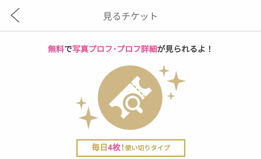 1日4枚見るチケットが配布されます。それにより、「プロフィール詳細」と「プロフ写真」を無料で閲覧できます。